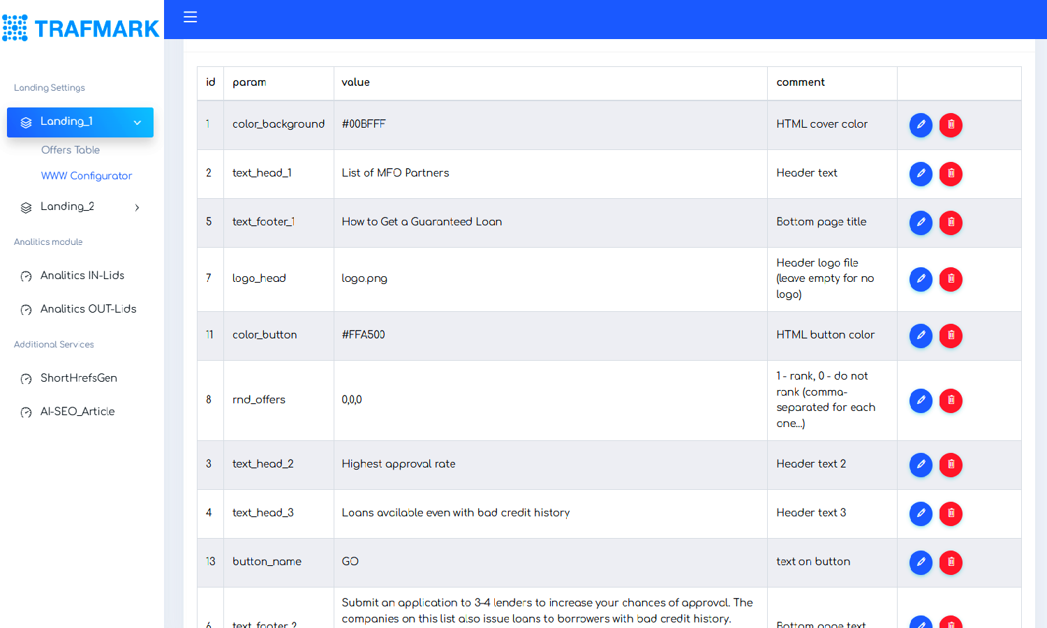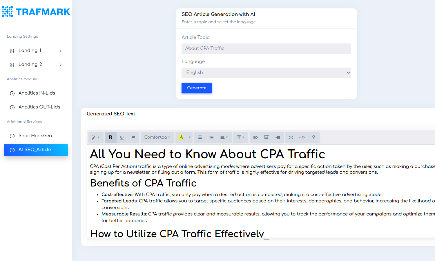 TrafMark provides advanced tools for managing traffic, building storefronts, tracking leads, and optimizing your marketing performance. Below are the platform’s key features.
